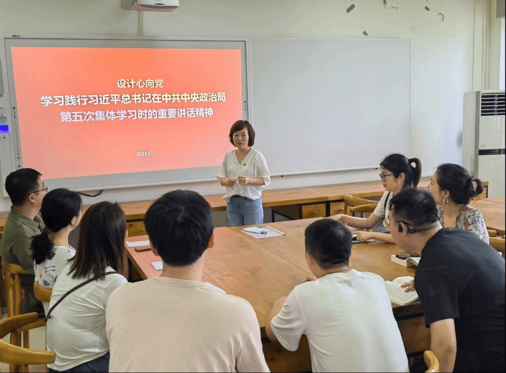 为进一步学习贯彻习近平新时代中国特色社会主义思想主题教育,将理论学习做实、做深。近日,设计学院传媒设计教研室党支部举行了一次充满“党味”的学习活动,党支部书记唐春妮围绕学习习近平总书记在中共中央政治局第五次集体学习时的重要讲话精神为全体党员同志开展专题党课。