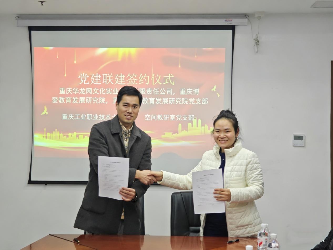 活动由空间教研室党支部宣传委员李文骥主持。会上,赵海如书记介绍了支部基本情况、特色工作及空间设计领域的专业优势,彭发清书记阐述了重庆博爱教育发展研究院与重庆华龙网文化实业发展有限责任公司的联系,以及重庆博爱教育发展研究院党支部的建设情况与业务方向。随后,双方围绕《党支部党建联建共建框架协议》核心内容深入磋商,达成一致共识。在全体党员见证下,两位支部书记共同签署协议并交换文本,合影留念。