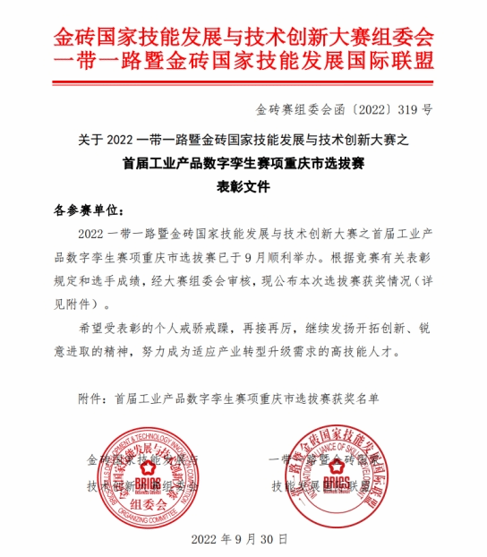 近日,由金砖国家工商理事会、教育部中外人文交流中心等联合主办,我校承办,上海曼恒数字技术股份有限公司技术支持的2022一带一路暨金砖国家技能发展与技术创新大赛首届工业产品数字孪生重庆市赛落下帷幕。我校设计学院师生在本次比赛中获高校组一等奖、教师组一二等奖。