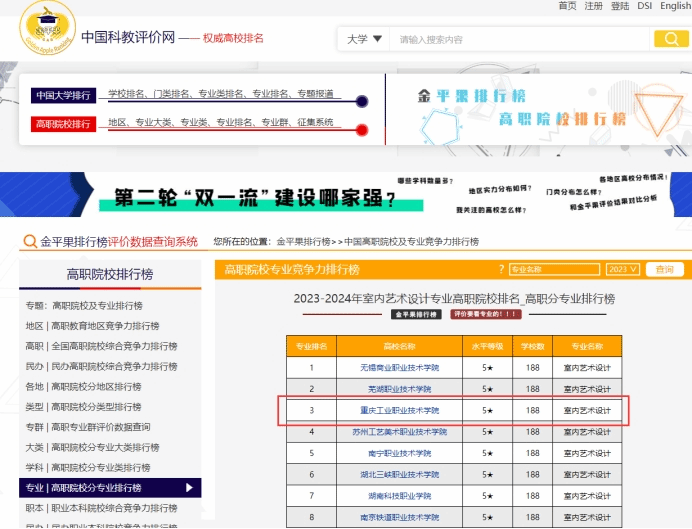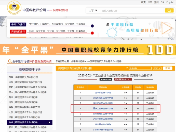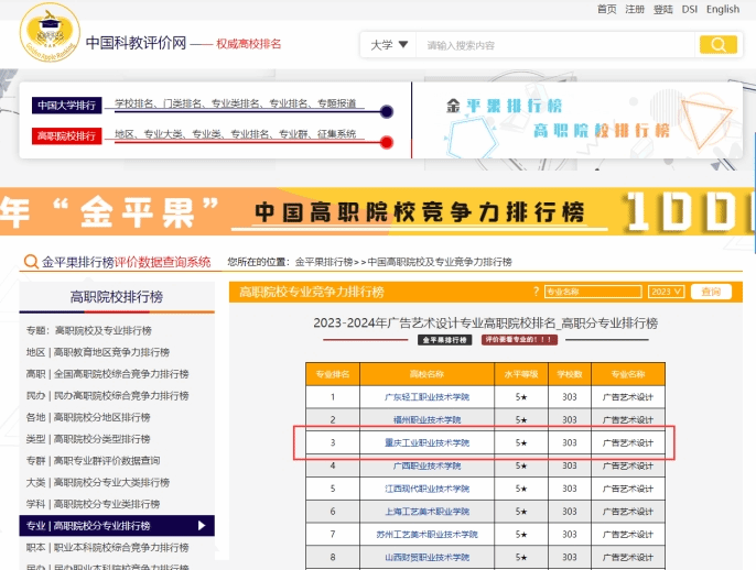 学校设计学院广告艺术设计专业、室内艺术设计专业荣获2023年全国“金平果”高职院校专业排行榜第3名,工业设计专业荣获2023年全国“金平果”高职院校专业排行榜第4名。