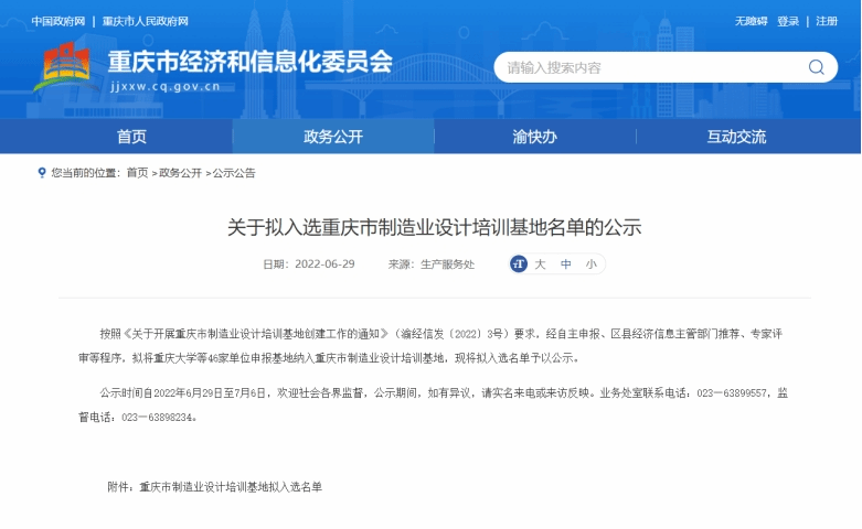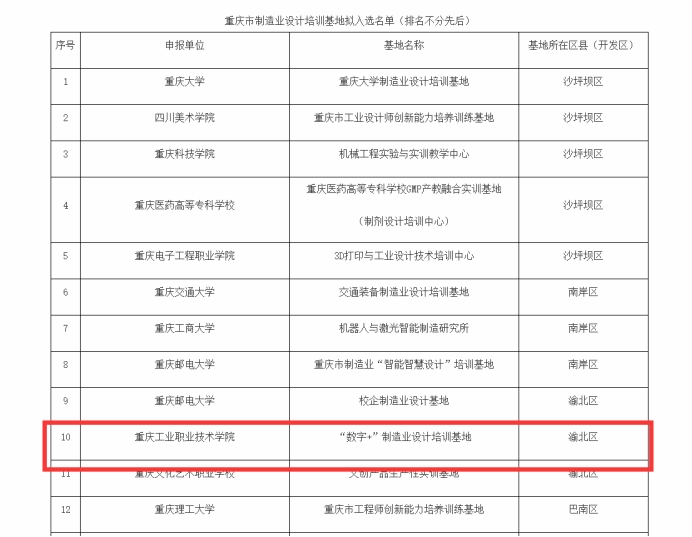重庆市制造业设计培训基地拟入选名单公示
