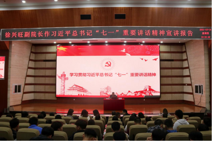 2021年1015日,徐兴旺副院长在图书馆第一学术报告厅开展习近平总书记“七一”重要讲话精神宣讲。设计学院党支书记张科,学工办主任毛璞,辅导员张洁灵、董俊宏、杨玲,建筑学院教师代表以及设计学院和建筑学院学生代表。他强调要深入学习贯彻习近平总书记“七一”重要讲话精神,深刻领会讲话的重大意义、丰富内涵、核心要义和实践要求,牢记初心使命,坚定理想信念,践行党的宗旨,坚持以史为鉴、开创未来,更好地把习近平总书记殷殷嘱托全面落实在重庆大地上,在新的征程上奋力开创更加美好的未来。