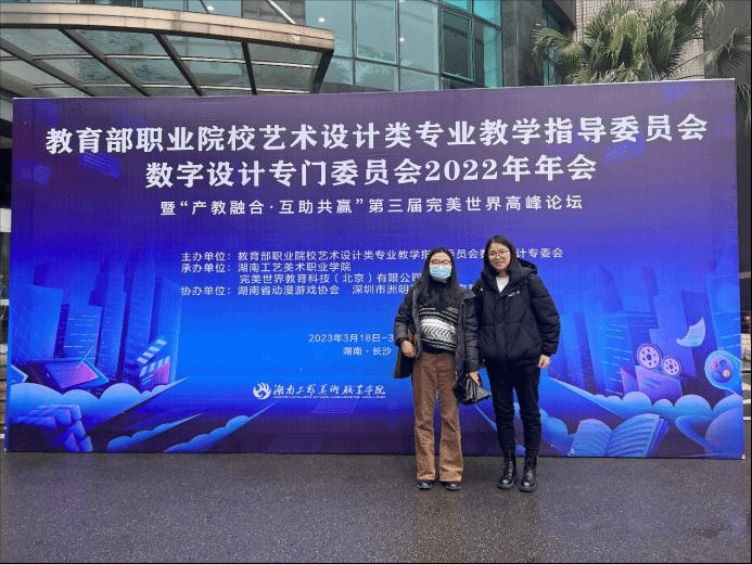 近日,设计学院传媒设计教研室教师郭一可、陈思颖参加了教育部职业院校艺术设计类专业教学指导委员会数字设计专门委员会2022年年会暨“产教融合·互助共赢”第三届完美世界产教融合高峰论坛。该会议由湖南工艺美术职业学院和完美世界教育科技(北京)有限公司承办。教育部职业院校艺术设计类专业教学指导委员会(以下简称“教指委”)秘书长张来源、湖南省教育厅职成处处长崔书芳、完美世界教育董事长王雨蕴以及来自全国150多所职业院校和行业、企业的领导、嘉宾共300余人出席会议。
