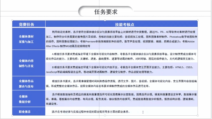 之后,由北京北测数字科技有限公司的企业专家韩老师,从竞赛要求、竞赛环境、竞赛任务、竞赛平台等多个方面为各单位的参赛选手全方面解析了本次竞赛。竞赛要求上,韩老师特别强调了本次新职业大赛在参赛选手的限定、要求、数量,在竞赛任务和竞赛平台上,针对全媒体运营师选拔赛从全媒体素材采集预加工、全媒体内容制作与开发、全媒体作品聚合与发布、全媒体数据分析、职业素养5个模块进行详细解析,并提出参赛选手的训练方向及建议。
