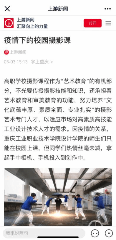 受疫情影响,设计学院师生将课堂搬到了校园内,利用手中的相机、手机投入到创作中去,用镜头捕捉大学生活的精彩瞬间,展现了运动之美、青春之美、和谐之美。这种“技能+美育”的授课方式,吸引了上游新闻等多家媒体的关注,更促进了校园文化建设,为职教周添彩。