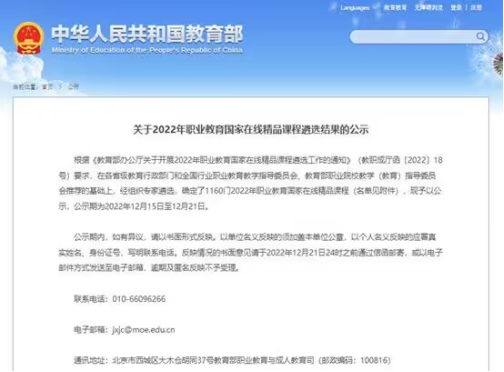 国家在线精品课程的建设是全面贯彻落实《国家职业教育改革实施方案》的具体举措,也是《职业教育提质培优行动计划(2020年—2023年)》的重点建设任务。本次遴选工作由教育部组织开展,共确定了1160门职业教育国家在线精品课程。
