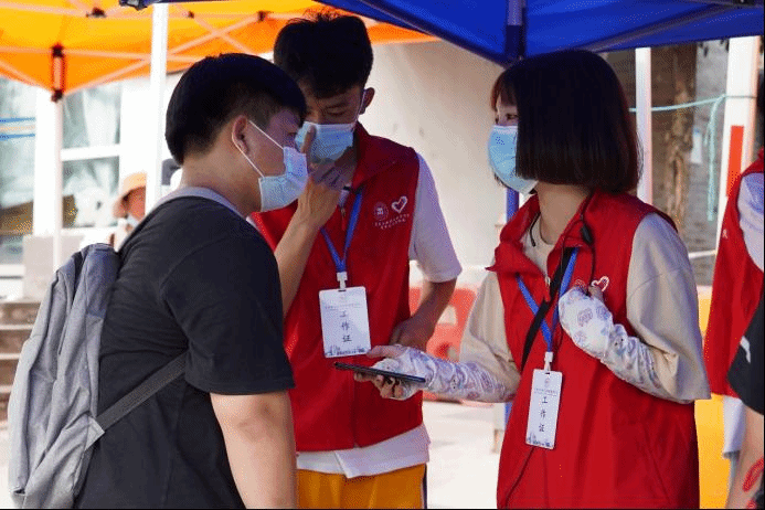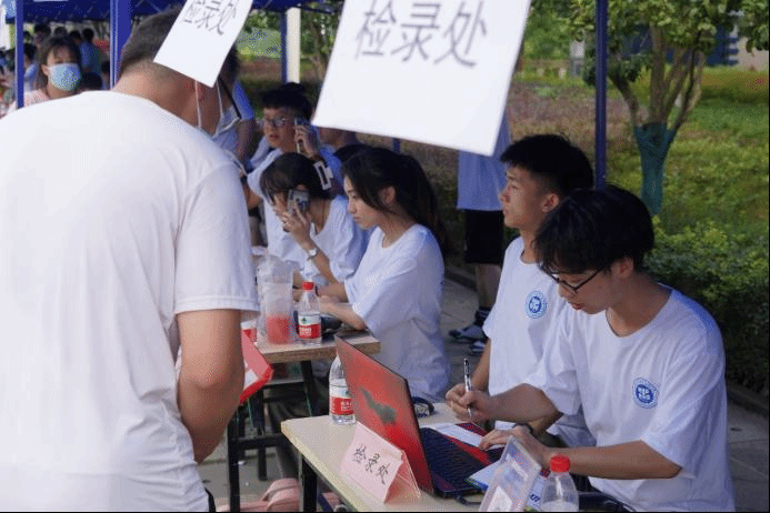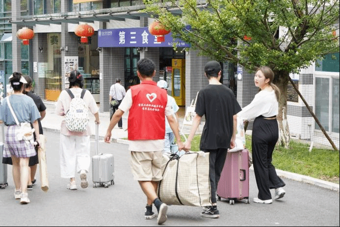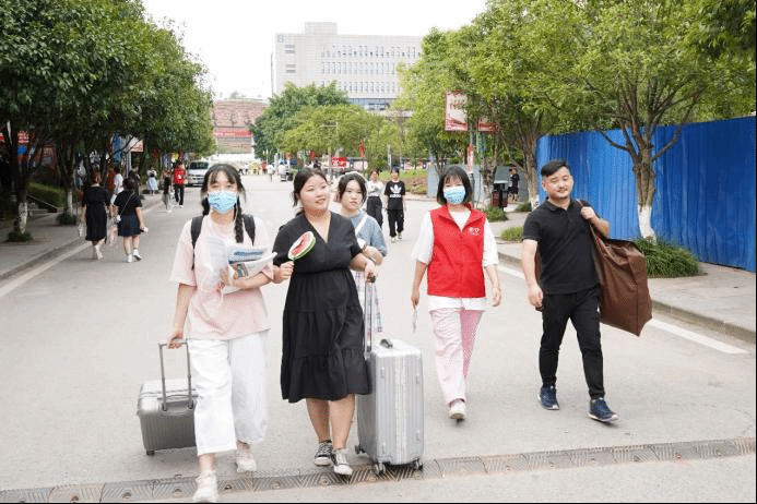 为做好常态化疫情防控形势下的迎新工作,本次迎新学院设立迎新志愿服务点,组织学生志愿者,统一着装,分别在重庆西站、重庆北站设立迎新接待点,用专车接送新生到校报到。考虑到疫情防控要求,学生报道劝导家长不要陪同进校,新生在通过核酸报告检查和体温检测后由志愿者们帮助搬运行李,介绍学院情况,引导办理入学手续。哪里需要帮助,哪里就有志愿者的身影。炎热的天气下,志愿者们满脸布满了汗水,衣服也被沁湿,但在这样的情况下,她们仍然坚持在自己的岗位,让新生感受到学院这个大家庭的温暖。