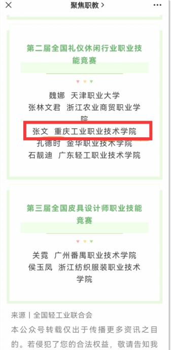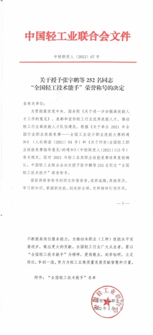近日,中国轻工业联合会下发《关于授予张宇鹏等252名同志“全国轻工技术能手”荣誉称号的决定》,以表彰在2021年全国行业职业技能竞赛--轻工各类竞赛中取得优异成绩的选手。我校设计学院教师张文(女)荣获“全国轻工技术能手”荣誉称号。