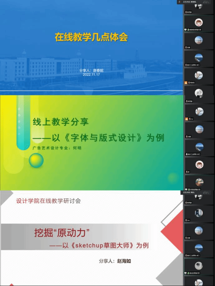 副院长刘蘅对本周开展线上教学的情况进行通报,邀请唐春妮、何明、赵海如三位老师针对在线教学经验和方法进行了分享和交流。传媒教研室主任唐春妮教授注重在教学过程中的仪式感以及师生间的情感传递,利用多平台相结合的方式对课堂作业做出即时反馈,通过适当增加头脑风暴等课堂小练习让课堂内容变得紧凑、充实;广告艺术设计专业负责人何明老师从人才培养方案和“学赛训”互促教学的角度,分享了如何系统性地将课程内容融入专业课程体系以达到提高学生学习积极性和效果的目的;赵海如老师则以课程《Sketchup草图大师》为例,分享了激发学生线上学习动力源的策略,从学生、教师、教学案例三方面营造积极的线上课堂,增强了线上授课的趣味性。
