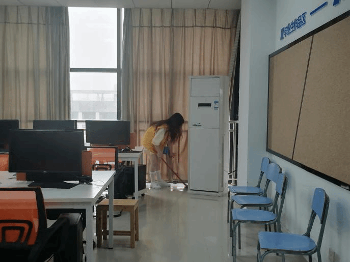 参加此次活动的志愿者同学们分工有序地对学院教室、走廊、楼道,B栋大厅等场所进行清洁卫生打扫。志愿者同学们认真清扫教室,画面格外美丽。在同学们共同努力下,很快各教室变得窗明几净、焕然一新。