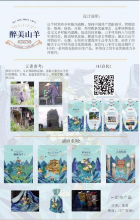 本次设计学院宣传画设计大赛,受助学生踊跃参与,创作出了很多优秀的作品。经过学院严格公正的评选,共评选出了一等奖2名,二等奖5名,三等奖8名,优秀奖15名。其中来自2019级广告设计专业301班的朱莹同学,利用自己的专业优势助力乡村振兴,通过对山羊村坚持中国共产党的领导,坚持乡村振兴战略,贯彻创新、协调、绿色、开放、共享的新发展理念,走中国特色社会主义乡村振兴道路,促进共同富裕等一系列的事件的描绘,在此次大赛作品设计的基础上,还制作宣传山羊村的H5及一系列包装和衍生产品,收到了一致好评。