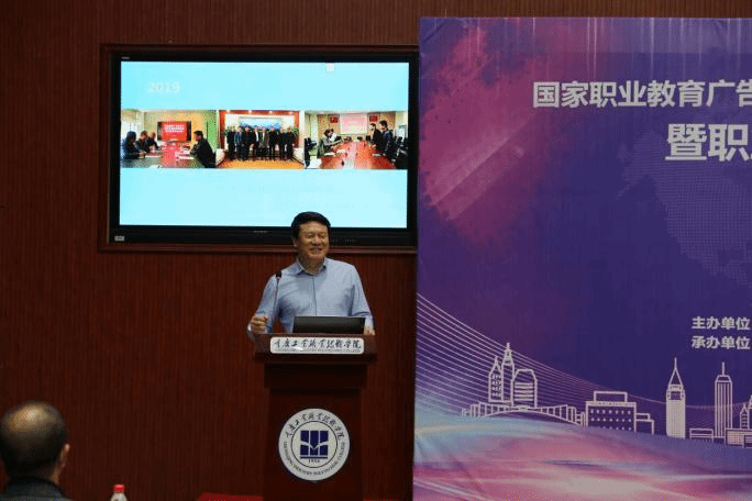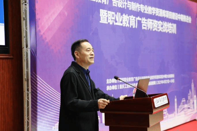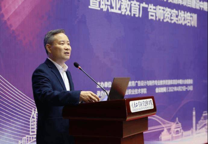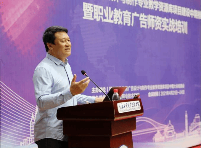 重庆工业职业技术学院副院长赵柏森教授对大会致辞,他认为职业教育专业教学资源库是“互联网+职业教育”的重要实现形式,是推动信息技术在职业教育教学和培训中的重要手段。重庆工业职业技术学院重视资源库建设工作,拟从三个方面让资源库发挥更丰富的内涵:一是在专业课程中探索富有特色的课程思政内容;二是将企业项目、企业案例融入到教学内容与技能训练中,优化高等职业的类型定位;三是丰富资源形式,将知识性和趣味性结合起来,通过视频、动画、虚拟仿真、试题库等形式,让学习者在愉悦中获取知识技能。希望大家通过国家职业教育广告设计与制作专业教学资源库建设,为职业教育的“双高”建设助力。