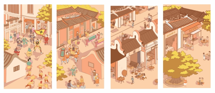 在考察基础上,各小组作了开题汇报,指导教师对设计主题和设计形式给予了建议,各小组分别确定非饮即食(广东糖水文化)、霞刻(陈家祠元素与高达形式结合)、栖息(西关小姐和东山少爷的故事)、南国楼宇(东山洋楼、陈家祠、开平碉楼)、人设牌坊、儿拾(童年记忆)的设计主题,并根据相应主题进行设计创作。在接下来的时间,在广轻指导老师石靓迪、李尔尘、冯吕华阳、牛尧,重工指导老师张文,以及企业李老师的指导下,各小组开始深入设计,不断完善文案、草图、主视觉形象,以及部分延展应用的设计。设计中,指导老师对岭南元素提炼、南国风情形色、创意、构图、版式等给予了指导。