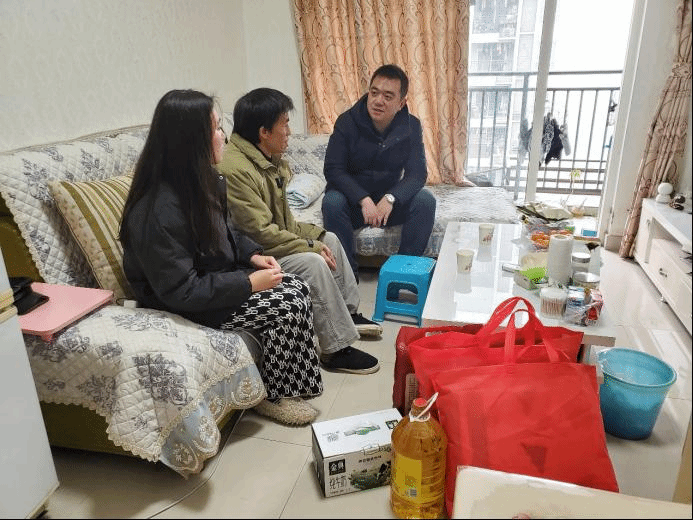 1月29号中午,设计学院党总支书记苏效圣、专职辅导员杨玲到渝北区空港乐园公租房慰问我院家庭经济困难学生,并代表学院向受访学生家庭送上棉被、大米、油、牛奶等生活用品。