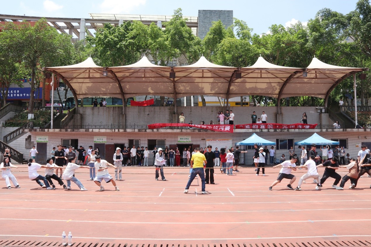 比赛中,各学院队伍蓄势待发,他们紧握长绳,重心后压,按照节奏协同发力。在胜负难分的关键时刻,大家毫不退却,咬紧牙关不畏难,用坚持和汗水诠释了团队拼搏的精神。拉拉队员们的呐喊助威声响彻全场,赛场气氛热烈活跃。