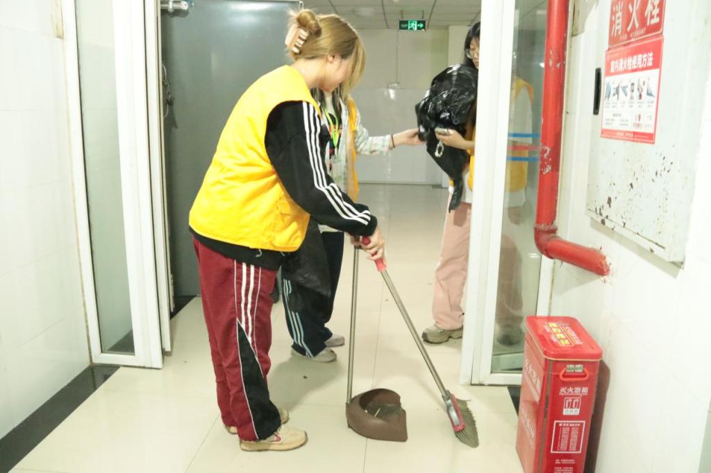 活动当日,志愿者们迅速集结,有序地分成多个小组,协同合作开展清洁工作。负责清扫地面垃圾的小组,他们手持扫帚,细致入微地清理着每一处角落;擦拭扶手栏杆的志愿者们,带着抹布与清洁剂,认真地擦拭着每一寸栏杆,使其光亮如新;专注于检查消火栓等设施的志愿者们,则以严谨的态度,仔细查看设备是否完好无损、能否正常使用。在整个过程中,志愿者们用自己的实际行动生动诠释了 “奉献、友爱、互助、进步” 的志愿服务精神,他们忙碌的身影成为校园中一道亮丽的风景线。此外,志愿者们还充分利用此次活动的契机,积极化身消防安全知识的传播使者,他们向过往的同学热情地宣传消防安全知识,以通俗易懂的语言讲解火灾的预防、逃生的技巧以及日常消防设施使用的要点等内容。