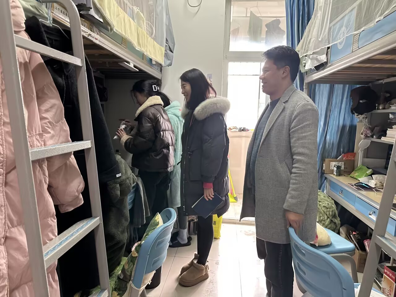 走访过程中,辅导员们详细了解学生假期生活、返校适应情况及新学期规划,重点检查了宿舍卫生、用电安全与设施维护情况。卓坤书记强调了宿舍安全的重要性,并提醒同学们要严格遵守宿舍管理规定,禁止使用违规电器,确保住宿环境的安全和生活的有序。