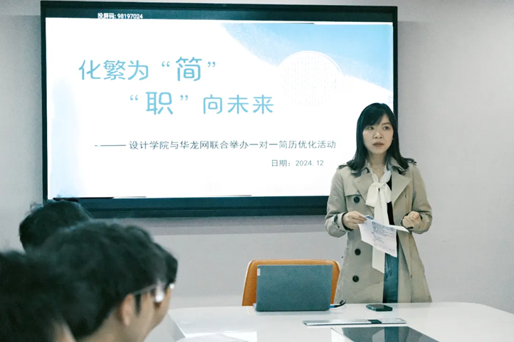 二是聚焦个性化辅导,联合校企力量提供简历优化服务。设计学院邀请华龙网专家亲临“一站式”学生社区开展“化繁为简、职向未来”专题讲座,为学生传授简历撰写与面试技巧,剖析求职关键环节,助力精准就业。此次活动既是一次学业就业交流,又是一场意义深远的职业发展辅导,通过“零距离”探察学生学业就业状况,悉心倾听诉求,精准发力,为同学们纾困解难,深挖适配学生发展的新路径,铺就就业指导工作进阶之路。