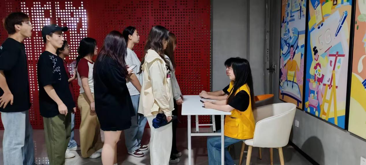 活动中,新生们有序参观设计作品展示区,色彩丰富、创意十足的画作与设计产品,让大家直观感受设计专业魅力,激发创作热情。在交流环节,学院志愿者身着黄色背心,为新生们详细介绍专业课程、实践平台,解答学习与生活疑问,现场互动热烈,新生们对未来学习有了更清晰认知。