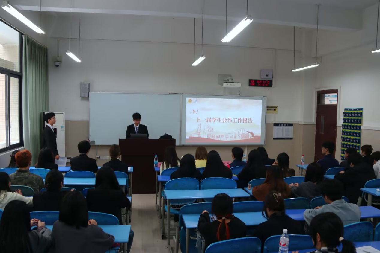 随后,上一届学生会负责人作工作报告,全面回顾了学生会在思想引领、活动开展与权益服务等方面的工作成果,并客观剖析了存在的不足,报告最后对未来工作方向提出了展望与建议。