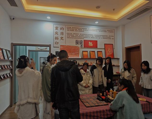 随后的体验环节中,同学们在古法制香、剪纸、拓印、漆扇等非遗技艺展开实践,使同学们感受到传统技艺的指尖温度,体会这些传统技艺背后所蕴含的心血与传承,更加深刻的感受到工匠精神的不易。在“重庆拓印的历史”展示区,老师演示了拓印工具的使用方法,同学们亲手操作,将石板上的纹样拓印成红色作品;在漆扇制作区,大家跟着老师学习扇面绘制的基础技巧,在动手过程中体会传统工艺的细腻与匠心。现场还有同学身着汉服参与体验,传统服饰与非遗技艺相映成趣,让活动更具沉浸感。