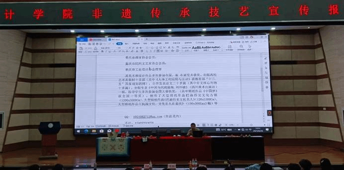 626号下午,设计学院“非物质文化遗产保护月”活动之非遗传承技艺知识讲座在图书馆第一报告厅举行。本次讲座以“人人都是传承人——非物质文化遗产活态传承与创新推广”为主题,邀请了渝北区民间文艺家协会副主席兼秘书长郑盛仪、副主席顾倩、李红等多位非物质文化遗产传承人出席,设计学院部分师生参加活动,讲座由设计学院教师李采主持。