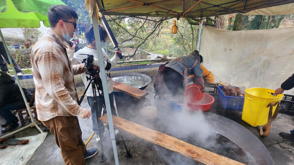 “要注意捕捉腊肉在阳光下的光泽,确保腊肉在自然光线下的每个细节都能在直播中展现。”在红岸村巴韵腊肉基地,为了给村民提供更好的直播效果,彭明朗和学生们一边调试设备一边提醒直播注意事项。