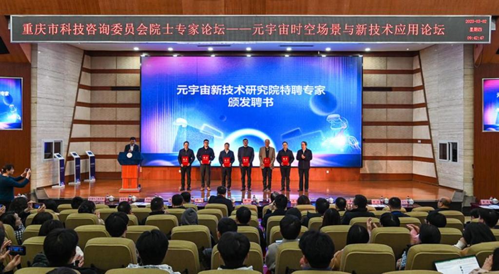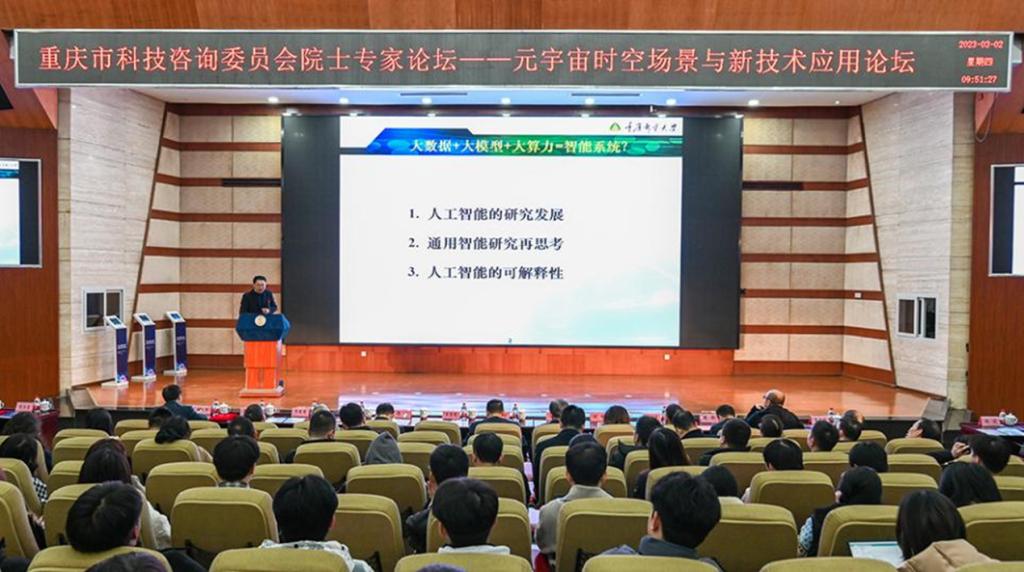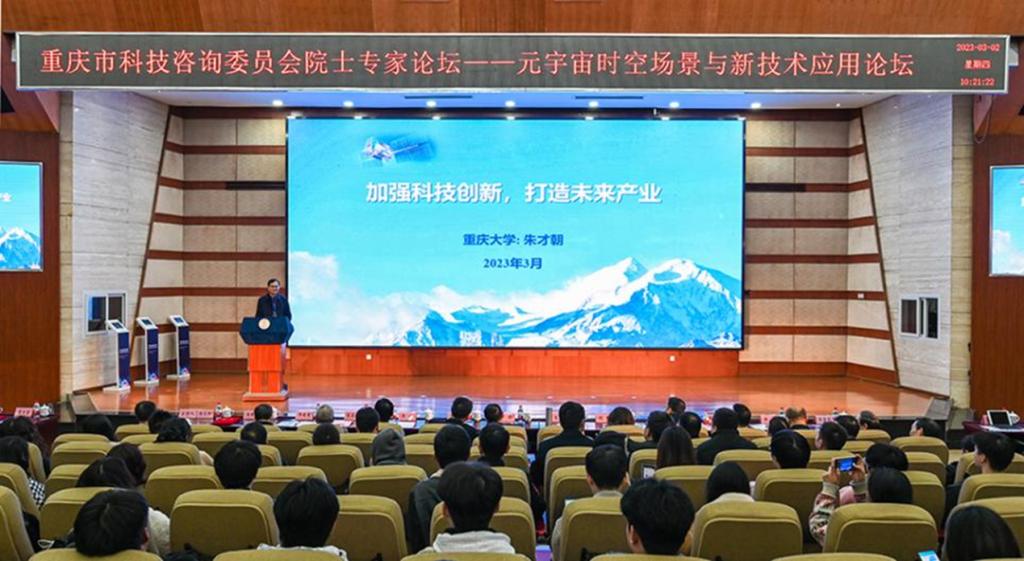 2023年3月2日,重庆市科技咨询委员会院士专家论坛——元宇宙时空场景与新技术应用论坛在重庆工业职业技术学院举办。重庆市科技局战略法规处处长廖明,市教委科技处处长刘畅,四川外国语大学党委书记邹渝,重庆邮电大学党委常委、副校长王国胤,重庆大学校长助理、重庆大学科学技术发展研究院院长、前沿交叉学科研究院院长朱才朝,国家督学、市高等职业技术教育研究会会长张亚杭,市重点产业人力资源集团有限公司董事长周泽,我校党委副书记、院长郭天平,副院长秦传江以及来自政校行企多方的专家学者、高校领导、行业代表等共计300余人出席论坛。本次论坛聚焦元宇宙产业发展、新技术融合应用、人工智能、科教融汇、数字产业人才培养等议题,设立了“线上活动”和直播平台。论坛分为两个阶段,第一阶段由郭天平院长主持,第二阶段由袁苗达处长主持。