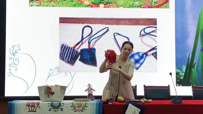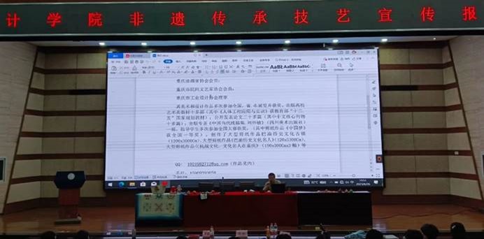 6月26号下午,设计学院“非物质文化遗产保护月”活动之非遗传承技艺知识讲座在图书馆第一报告厅举行。本次讲座以“人人都是传承人——非物质文化遗产活态传承与创新推广”为主题,邀请了渝北区民间文艺家协会副主席兼秘书长郑盛仪、副主席顾倩、李红等多位非物质文化遗产传承人出席,设计学院部分师生参加活动,讲座由设计学院教师李采主持。