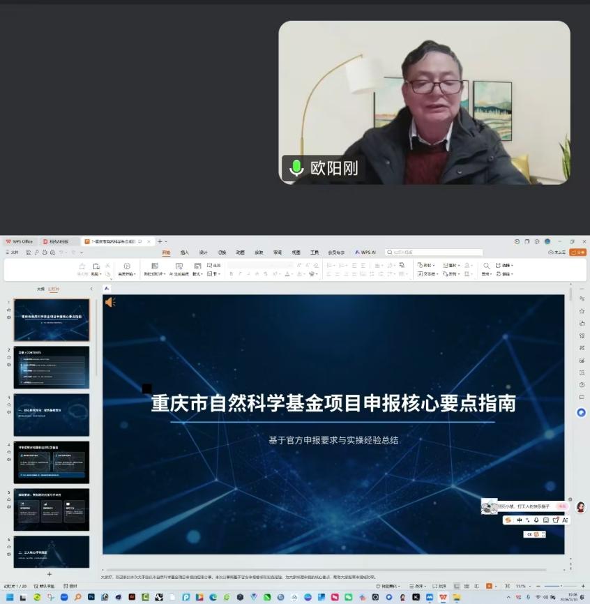 为助力学院教师精准把握重庆市自然科学基金项目申报要点,提升申报成功率,3月10日晚7点,设计学院线上开展重庆市自然科学基金项目申报指导讲座,特别邀请欧阳刚教授担任主讲人。