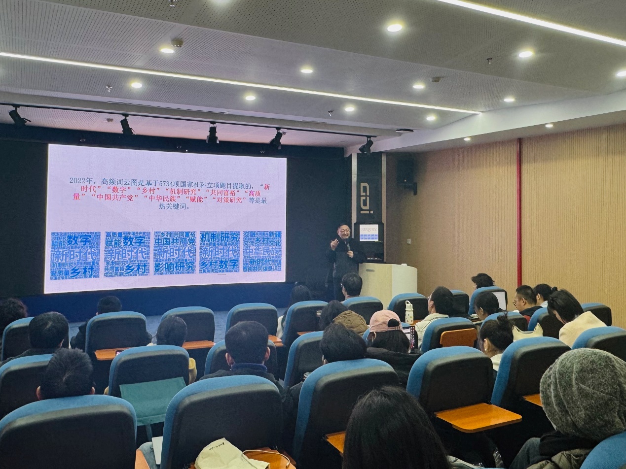 在讲座中,苏金成教授紧扣高校社科项目申报的实际需求,系统分享了其作为申报者与评审专家的双重经验。他首先从国家社科基金的选题逻辑切入,深入剖析了如何立足学术前沿、国家需求与个人研究基础,确立具有竞争力的研究课题。随后,苏教授重点解读了评审过程中最为关注的“创新性、可行性、价值性”三大核心维度,并结合具体案例,细致阐述了申报书各环节的撰写要领与常见误区。