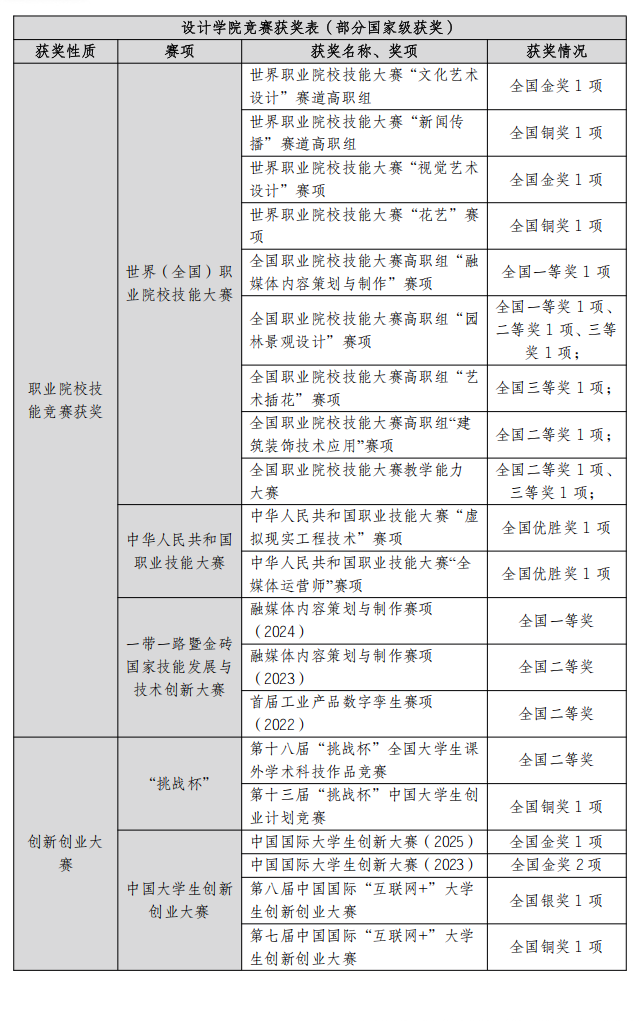 【丰硕成果】近三年学生积极参加技能大赛、双创比赛、学科竞赛等,获中国国际大学生创新大赛金奖、全国技能大赛一等奖、世界职业院校技能大赛金奖、全国大学生广告艺术大赛一等奖等省部级以上等级奖超400项。